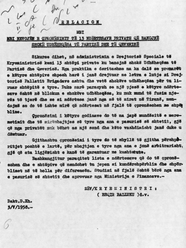 Në pranverën e vitit 1958, një dokument i firmosur nga zv/kryeministri Beqir Balluku do të vuloste një nga aktet më tipike të arbitraritetit të regjimit komunist në Shqipëri: shpronësimin e 13 vilave private në Tiranë, ku prej kohësh banonte udhëheqja e lartë e Partisë dhe e Qeverisë. Dokumenti, i përgatitur në formë “relacioni”, nuk ishte thjesht një vendim teknik mbi pronat, por një akt politik me simbolikë të thellë: kthimi i pronave private në pasuri shtetërore për të legjitimuar jetën luksoze të kastës në pushtet.