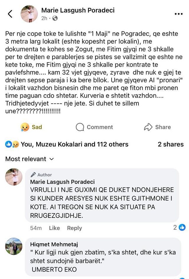 “Kam dokumenta që nga koha e Zogut. Kam fituar në tre shkallë gjykate për të drejtën e parablerjes dhe për kontrata të pavlefshme. Por prej 32 vitesh nuk gjej drejtësi, sepse paraja i ka bërë bllok çdo rruge ligjore. Ai që e përdor pronën time si biznes fiton para mbi tokën time dhe paguan me to çdo shtetar”, shkruan Maria në Facebook.