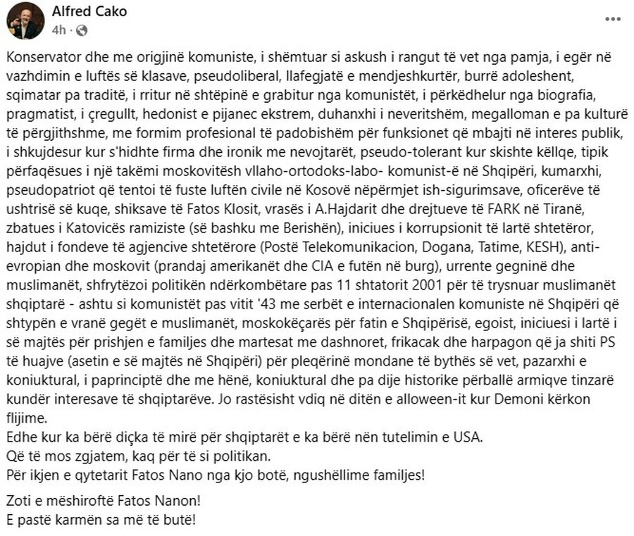 Ai ka postuar një status në “Facebook”, ku “vjell vrer” ndaj të ndjerit Fatos Nano. Cako “i ka numëruar” gjithë “të këqijat” Nanos, ku i vendos epitete si me origjinë komuniste, apo burrë adoleshent.