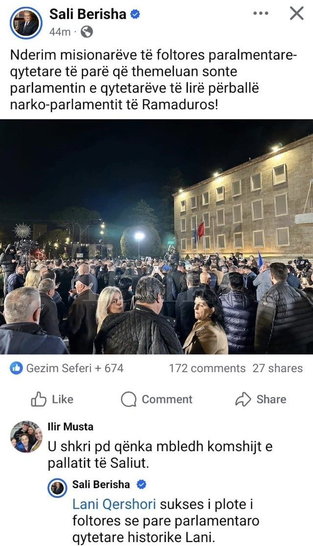 Një ndër komentuesit e parë ka qenë një qytetar që ka shprehur revoltën e tij në postimin e Berishës ku me ironi thotë: U shkri PD, qenkan mbledhur komshinjtë e pallatit të Berishës.