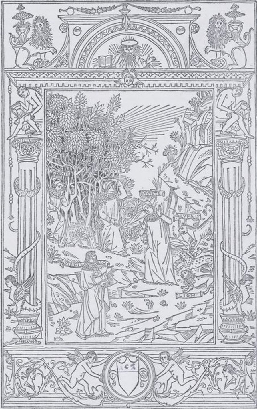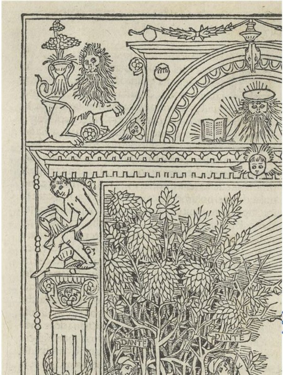 Benardino Benali me 3 mars të vitit 1491 bashkë me Mateo Kapkazën (Kodekën) nga Parma kishin botuar kolanën e parë të Komedisë Hyjnore të Dantes, që është madje edhe e para e ideuar si kolanë në fushën e botimeve të shtypshkruara, e mbajtur si një nga botimet më cilësore për kohën, e komentuar nga Kristoforo Landini, me një aparat ksilografik të plotë, në të cilën gjendet edhe nga një frontespic për secilën kantikë, me kornizë të njëjtë dhe me përmbajtje të ndryshme. Matheo di Codecá da Parma (Matteo Capcasa) më 29 nëntor 1493, pra ish-bashkëbotuesi i Benalit, e riboton këtë kolanë i vetëm, me ndonjë ndryshim të vogël. Frontespicet janë po ato të botimit të parë, por me një ndryshim vetëm për kantikën e Ferrit, frontespici i së cilës shoqërohet me një kornizë shtesë, siç do të shihet në ilustrimet e mëposhtme. Më 11 tetor të 1497 botohet Danthe alighieri fiorentino për Piero de Zuanne di Quarengii vetëm me një frontespic ksilografik për Ferrin, që është po ai i botimit të Mateo Kapkazës të 1493. Po kjo kolanë, Danthe alighieri Fiorentino historiado, me pak ndryshime, botohet më 12 qershor 1507 nga Bartholomeo de Zanni, vetëm me një frontespic, me atë të Ferrit të botuar më 1491. Si ilustrime më poshtë do të sjellim imazhet e frontespiceve të botimit 1491 dhe atë të Ferrit të botimit 1493.