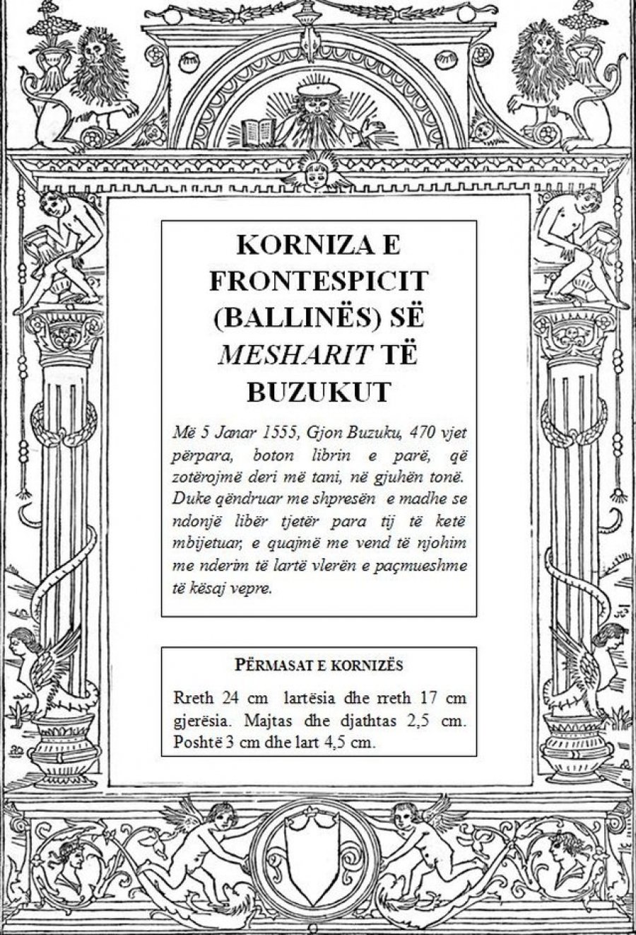 Aparati figurativ i ksilografive të Mesharit të Gjon Buzukut, për të cilin flitet gjerësisht te Buzuku i lehtëlexueshëm, do të ishte i mangët pa kryeksilografinë e këtij teksti të çmueshëm, që është korniza e frontespicit (e ballinës).