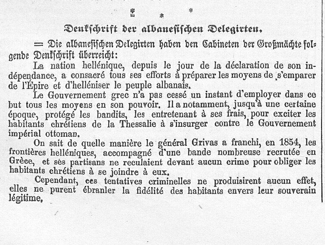 Populli shqiptar numëron dy milionë e treqind mijë shpirtra. Përballë dëshirave të ashpra të fqinjëve të tyre, në prani të rreziqeve që u kanosen, këto popullsi patriotike janë lidhur të gjitha së bashku me betime solemne, për t’i kushtuar të gjitha përpjekjet e tyre për të ruajtur nën autoritetin mbrojtës të Qeverisë Perandorake Osmane atdheun e tyre, kombësinë dhe gjuhën e tyre, duke e konsideruar për më tepër si një nga mjetet e nevojshme të reformës në vendin e tyre për arritjen e këtij qëllimi, arsimin publik. Për këto qëllime të gjithë shqiptarët, pa përjashtim, janë betuar se do të vriten deri në fund, në vend që t’u dorëzojnë grekëve territoret e Prevezës, Nardës, Janinës dhe rretheve të tjera të Shqipërisë, të cilat ata i lakmojnë. Nëse duhet të përthithen nga grekët, banorët e Shqipërisë më mirë do të vdisnin, me armë në dorë!