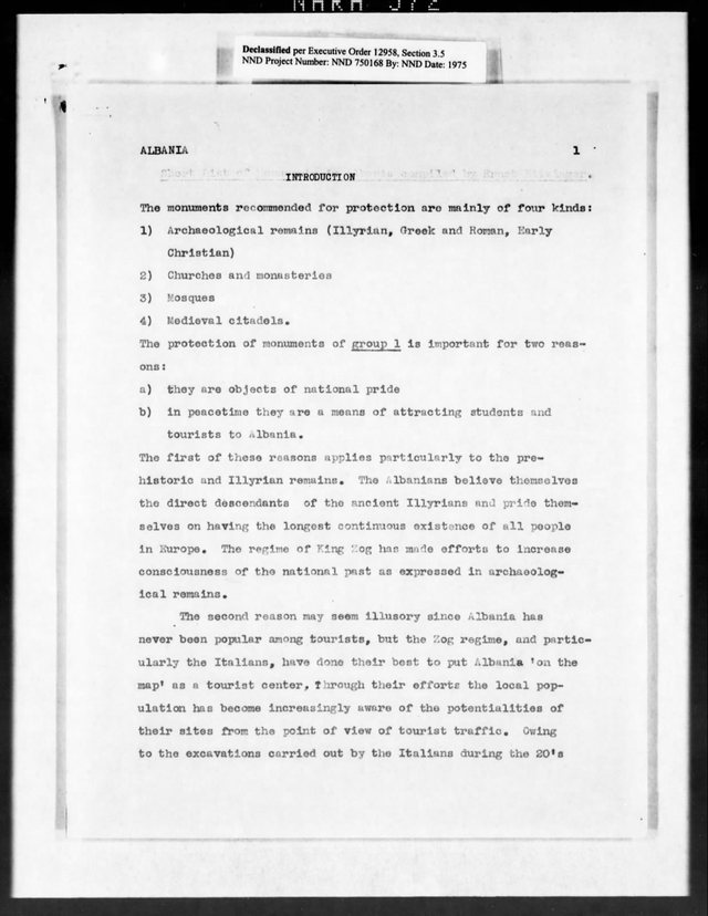 Në mesin e këtyre materialeve voluminoze gjendet edhe dosja e Shqipërisë, ku ekspertët amerikanë kanë përpiluar një listë të plotë të zonave që duhej të ruheshin me përparësi. Në faqen e parë të dokumentit nënvizohet qartë vlera e jashtëzakonshme e trashëgimisë ilire, e ndjekur nga periudhat greke, romake e bizantine — një renditje që dëshmon interesin e SHBA për shtresat më të hershme të historisë sonë.
