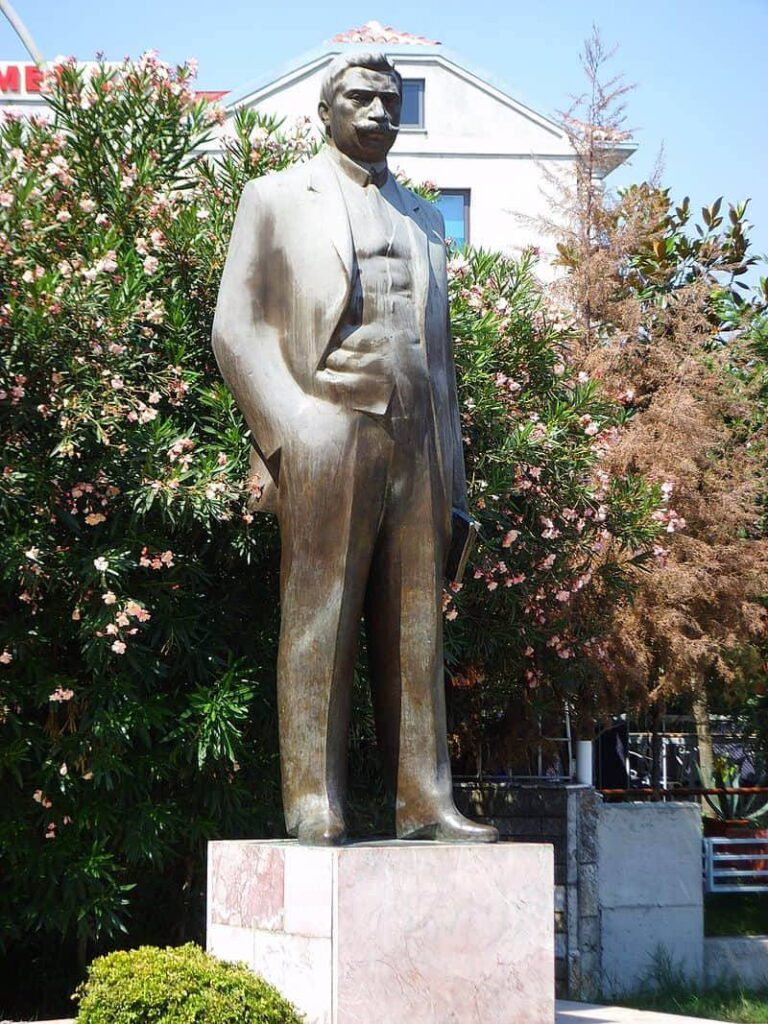 Silueta të qëndrueshme, me qëndrim të fortë, por pa tension; krijon një raport harmonik me hapësirën urbane përreth. Kostumi qytetar, i trajtuar me shenja minimale modelimi, vjen si shenjë e njeriut të dijes, jo të luftës. Koka dhe fytyra janë punuar me një realizëm të matur, ku vërehet qartësia e vështrimit: një shikim i qetë, i përqendruar, që sugjeron reflektim. Ky karakter i brendshëm – me ton etik dhe qytetërues – bëhet elementi kryesor i leximit ikonografik.