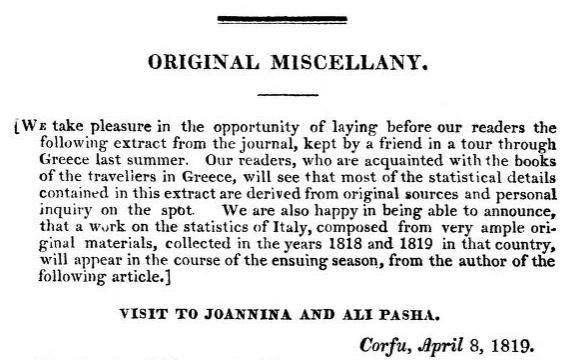 “VISIT TO JOANNINA AND ALI PASHA.” Original Miscellany, Corfu, April 8, 1819.