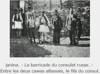 “janina. – La barricade du consulat russe. – Entre les deux cawas albanais, le fils du consul.” (Burimi i saktë i fotografisë do të ishte ideal, por përshkrimi është i mjaftueshëm).