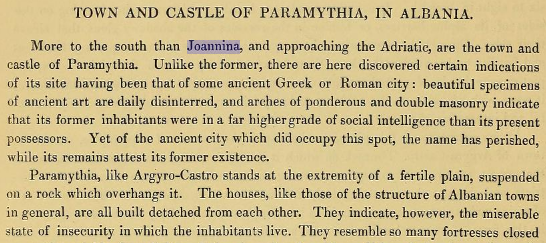 Më tej, karakteristikat arkitektonike dhe tipologjike të vendbanimeve në Epir shpeshherë theksonin një vazhdimësi me stilin shqiptar. Për shembull, në veprën e Thomas Allom dhe Robert Walsh, “Constantinople and the Scenery of the Seven Churches of Asia Minor”, në pjesën “TOWN AND CASTLE OF PARAMYTHIA, IN ALBANIA”, përshkruhet se “Paramythia, like Argyro-Castro stands at the extremity of a fertile plain, suspended on a rock which overhangs it. The houses, like those of the structure of Albanian towns in general, are all built detached from each other.” Ky përshkrim, duke e vendosur Paramithinë “në Shqipëri” dhe duke e krahasuar me Gjirokastrën, një qytet tipik shqiptar, thekson tiparet arkitektonike “Albanian towns in general”, duke nënkuptuar një vazhdimësi kulturore dhe arkitektonike që shtrihej nga jugu i Janinës. Kjo lidhje tregon një hapësirë gjeografike kulturalisht dhe arkitektonikisht shqiptare, ku Janina ishte një pikë qendrore.