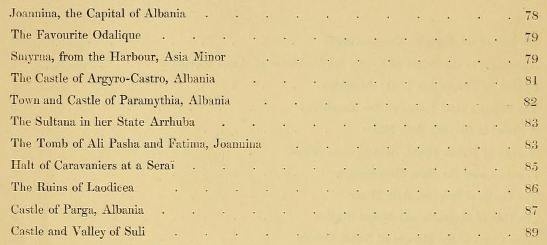 “JOANNINA, capital of Albania.” The New Tablet of Memory: or, Chronicle of Remarkable Events; with the Dates of Inventions and Discoveries in the Arts and Sciences; Biographical Notices of the Most Distinguished Persons of Every Age and Nation: Forming a Complete Epitome of Universal History. By Thomas Bartlett Esq. London: Thomas Kelly, 1841.