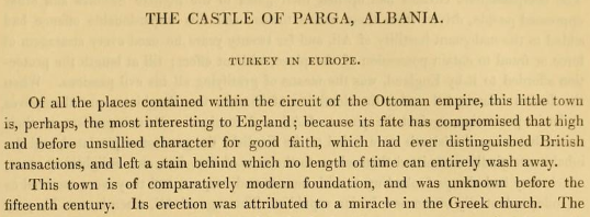 Allom, Thomas dhe Walsh, Robert. Constantinople and the Scenery of the Seven Churches of Asia Minor, Illustrated. Fisher, Son & Co., 1839. (Përfshirë “TOWN AND CASTLE OF PARAMYTHIA, IN ALBANIA”).