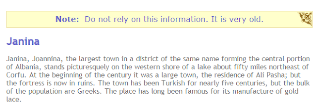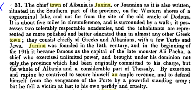 Përshkrime Gjeografike dhe Etnografike: Një tekst historik, i cituar në imazhet e bashkëngjitura, përmend: “31. The chief town of Albania is Janina, or Joannina as it is also written, situated in the Southern part of the province, on the Western shores of a cognominal lake…” Ky fragment jo vetëm që e quan Janinën “qytetin kryesor të Shqipërisë”, por thekson edhe praninë e shqiptarëve në përbërjen e saj demografike: “…they consist chiefly of Greeks and Albanians, with a few Turks and Jews.” Kjo dëshmon një njohje të gjerë të pranisë shqiptare si thelbësore për identitetin e qytetit.
