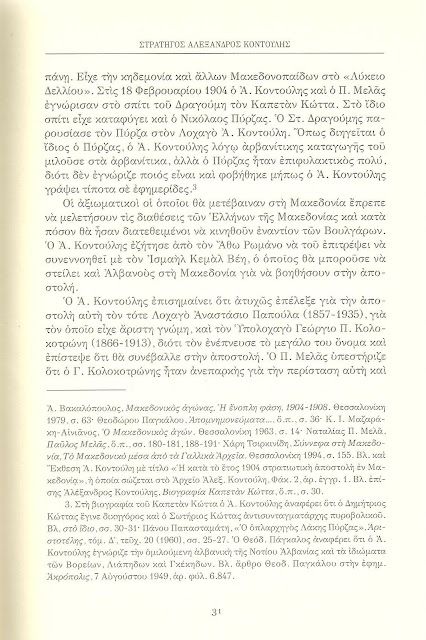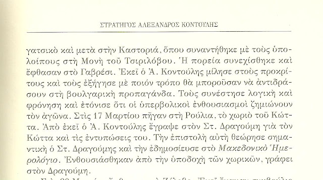 Bisedat me Kapedan Kotën: Në biografinë që Kontoulis shkroi për Kapetan Kotën (Kotas Christou) në vitin 1931, ai zbulon detaje intime. Gjatë orëve të pushimit, Kontoulis bisedonte me Kotën në shqip (Arvanitika). Kota, i cili mbante me krenari një monedhë të Aleksandrit të Madh në gjoks, i besoi Kontoulis jo vetëm idealet e tij, por edhe fatin e familjes. Pas vdekjes së Kotës, Kontoulis adoptoi dhe shkolloi dy fëmijët e tij në Athinë.