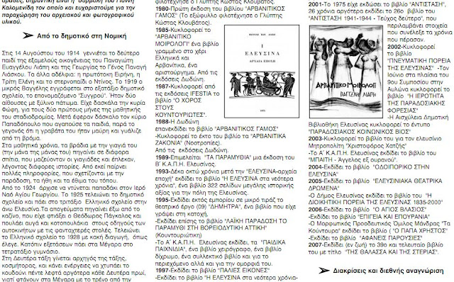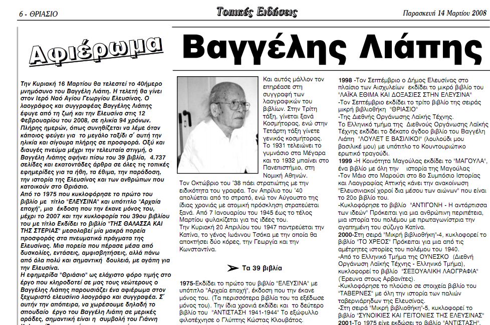 Vangjel Ljapi, folklorist, studiues dhe autor i shquar i Elefsinës, ndërroi jetë më 12 shkurt 2008, në moshën 94-vjeçare. Një memorial i 40-ditëshit u mbajt nje te dielë te atij marsi, në Kishën e Shën Gjergjit të Elefsinës. Shumë arvanitas u mblodhën në nderim të tij.