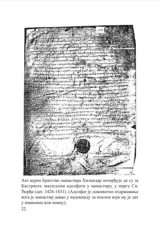 Në këtë akt, vëllazëria e manastirit të Hilandarit konfirmon se për Kastriotët janë blerë adelfatet (të drejta banimi dhe ushqimi të përjetshëm) në Pirgun e Shën Gjergjit. Dokumenti specifikon qartë natyrën e marrëveshjes:
