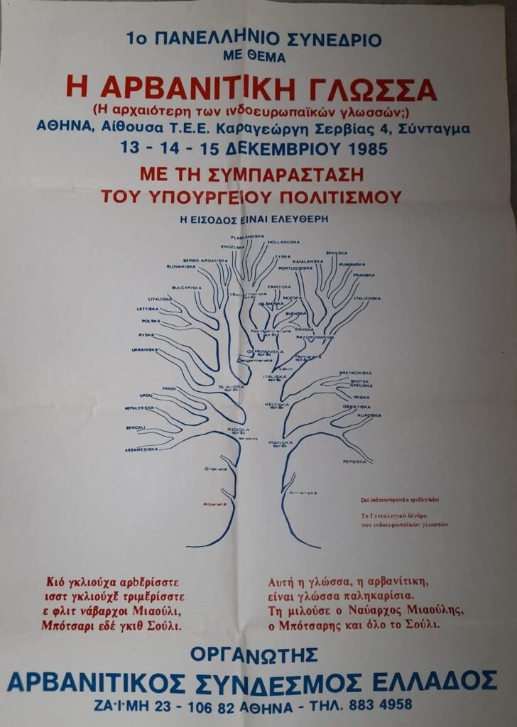 Posteri i Konferencës së 1-rë Panhelenike për Gjuhën Arvanitike (Athinë, 1985).