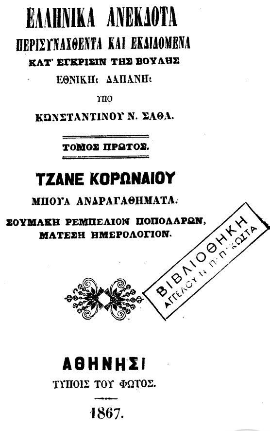 Kostandin N. Satha, “Hellenika Anekdota”, Athinë, 1867.