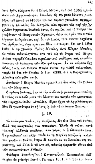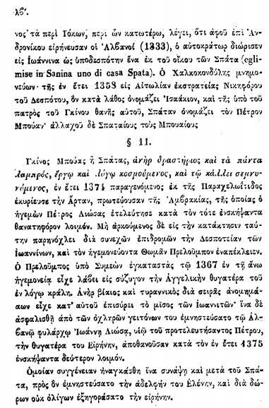 Sipas Sathas, mbiemri “Spata” nuk ishte vetëm një atribut personal i Gjinit, por i përkiste gjithë familjes së “Mpouaioi” (Bua). Ai shpjegon se, sipas zakonit arbëror, ky emër u mor nga vendet ku ata zotëronin ose ku kishin lindur. Interesant është fakti se Satha përmend ekzistencën e fshatrave me emrin “Spata” jo vetëm në Atikë, por edhe në Muzakie dhe në krahinën e Tomoricës (Fig. 2). Kjo dëshmon për një shtrirje të gjerë të këtij fisi në trojet shqiptare (Shpati në Elbasan apo Kosovë) para se emri të hidhte rrënjë në Greqi.