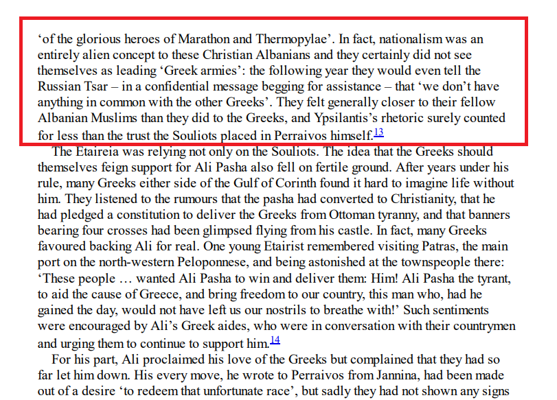 “Nacionalizmi ishte një koncept plotësisht i huaj për këta shqiptarë të krishterë (Suliotët)… Ata ndjeheshin përgjithësisht më afër bashkëkombësve të tyre shqiptarë myslimanë sesa grekëve.”