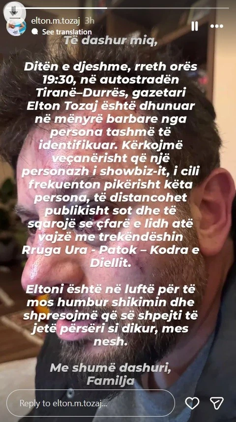 Vetë Tozaj ka reaguar përmes një postimi në rrjetet sociale, ku ka publikuar një fotografi në të cilën shfaqet me shenja të dukshme dhune në fytyrë, pas goditjeve të marra. Pamjet kanë shkaktuar reagime të shumta, ndërsa shqetësimi është rritur pas njoftimit të familjes për gjendjen e tij shëndetësore.