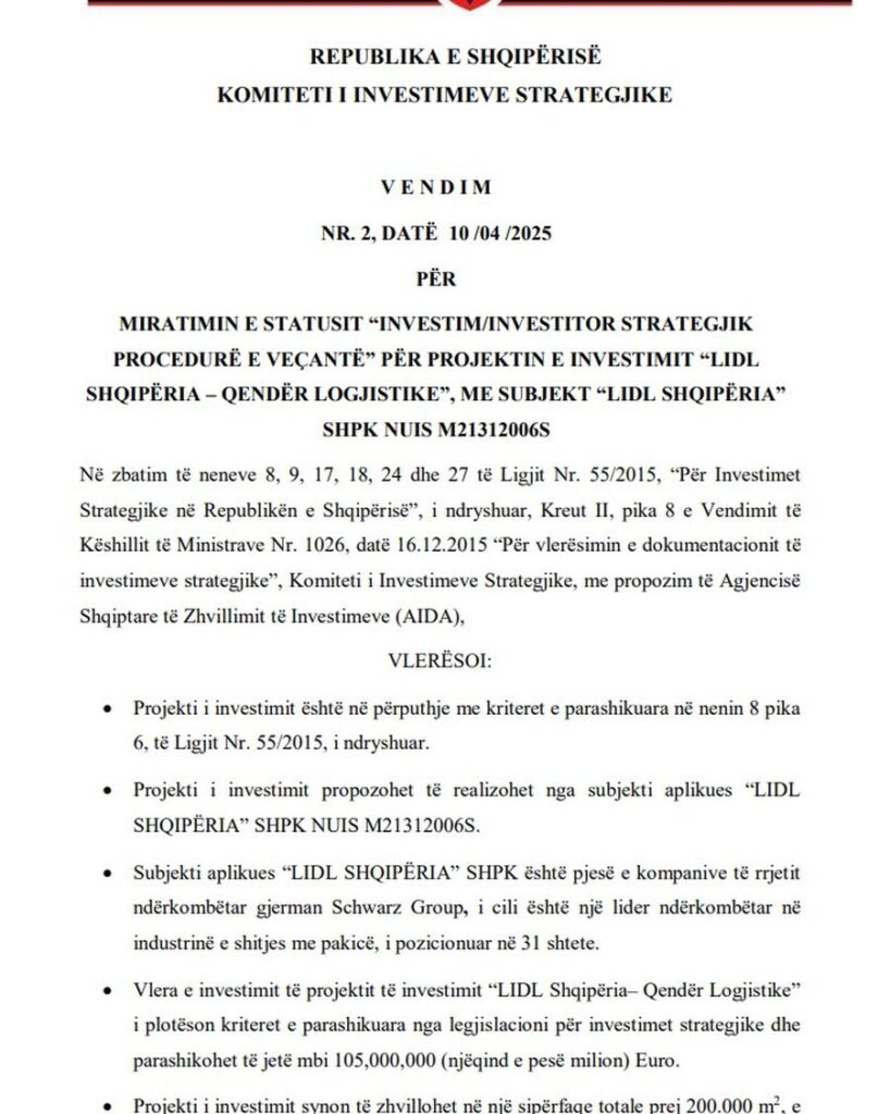 Komiteti i Investimeve Strategjike në mbledhjen e datës 10 prill 2025 miratoi dhënien e statusit investitor strategjik për “LIDL – Shqipëria Qendër Logjistike” me subjekt “Lidl Shqipëria” sh.p.k. Projekti i investimit strategjik parashikon realizimin e investimit mbi 105 milionë Euro. Ai do të zhvillohet brenda gjurmës së Projektit të Ri Tregtar të Integruar të Durrësit me Zhvillues Autoritetin Portual Durrës, sipas Vendimit të KKTKU me nr. 09, datë 27.07.2022. Investimi synon të zhvillohet në një sipërfaqe totale prej 200 mijë m2, e cila ndodhet pranë zonës logjistike portuale në Porto Romano, Durrës.
