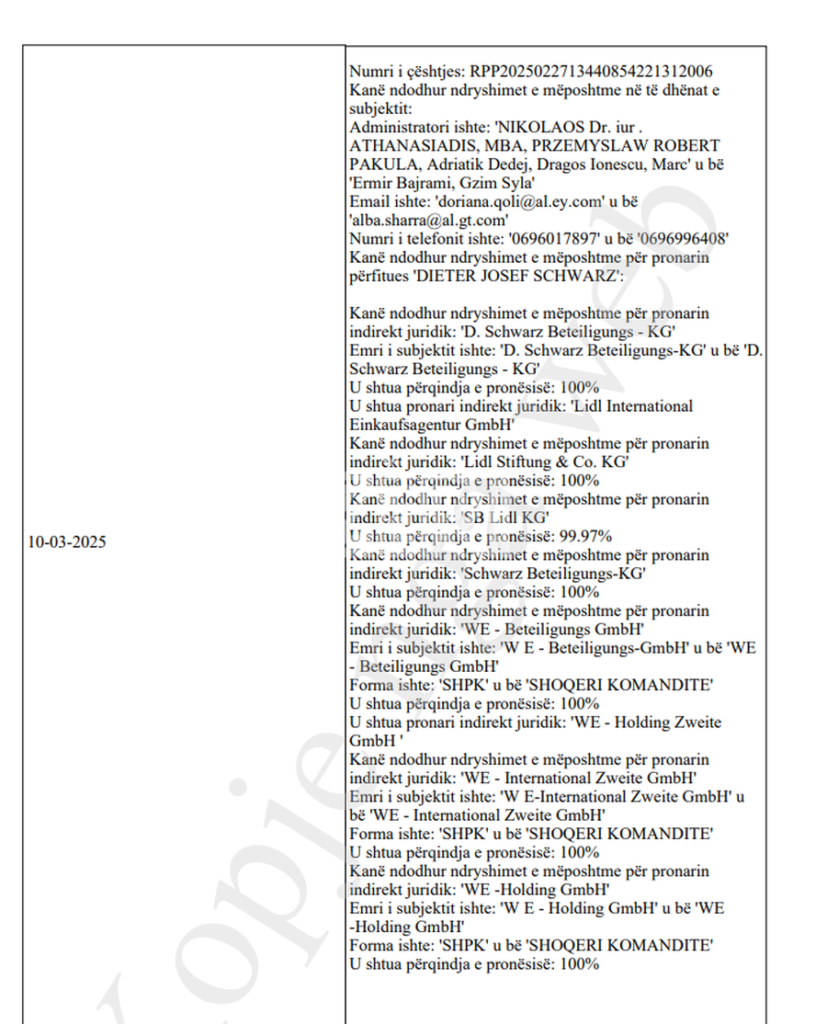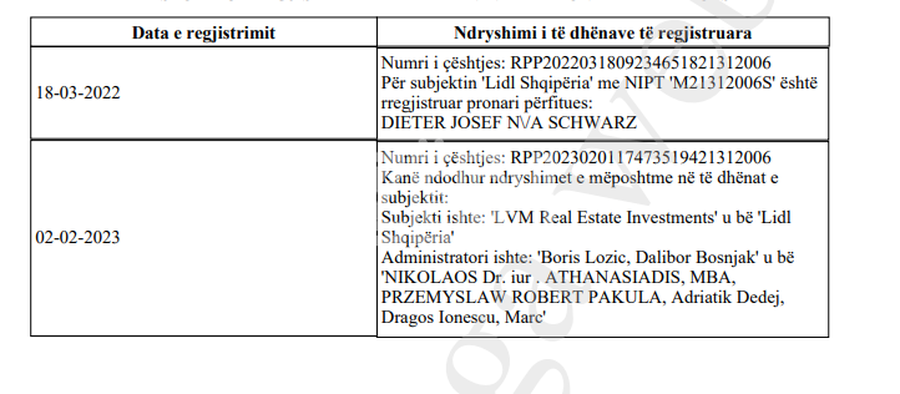 Kalimi i “LVM Real Estate Investments” në “Lidl Shqipëria” SH.P.K. është shoqëruar edhe me ndryshime në poste, ku brenda një periudhe 3-vjeçare, administratorët kanë ndryshuar disa herë. Referuar dokumentit të publikuar nag Ministria e Ekonomisë, Kulturës dhe dhe Inovacionit në lidhje me historikun e regjistrit të pronarit përfitues, rezulton se ‘LVM Real Estate Investments’ u bë ‘Lidl Shqipëria’ në shkurt të vitit 2023.
