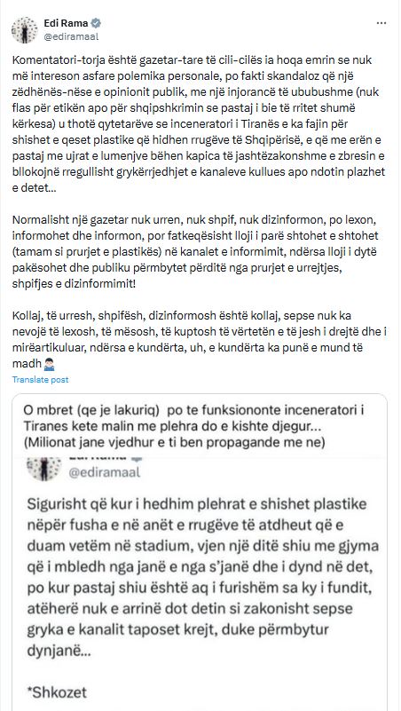 “Komentatori-torja është gazetar-tare të cili-cilës ia hoqa emrin se nuk më intereson asfare polemika personale, po fakti skandaloz që një zëdhënës-nëse e opinionit publik, me një injorancë të ububushme (nuk flas për etikën apo për shqipshkrimin se pastaj i bie të rritet shumë kërkesa) u thotë qytetarëve se inceneratori i Tiranës e ka fajin për shishet e qeset plastike që hidhen rrugëve të Shqipërisë, e që me erën e pastaj me ujrat e lumenjve bëhen kapica të jashtëzakonshme e zbresin e bllokojnë rregullisht grykërrjedhjet e kanaleve kullues apo ndotin plazhet e detet…