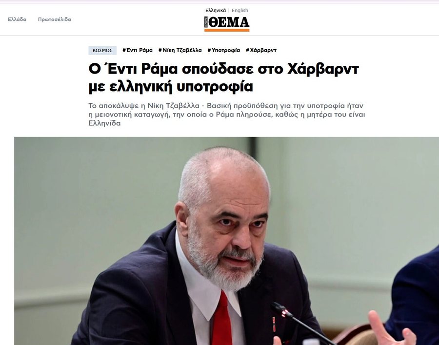 Media greke “Protothema” ka publikuar së fundmi një artikull në të cilin i referohet një deklarate të bërë nga ish-deputetja e Demokracisë së Ren, Niki Tzavella, lidhur me studimet e kryeministrit Edi Rama në Universitetin e Harvardit.